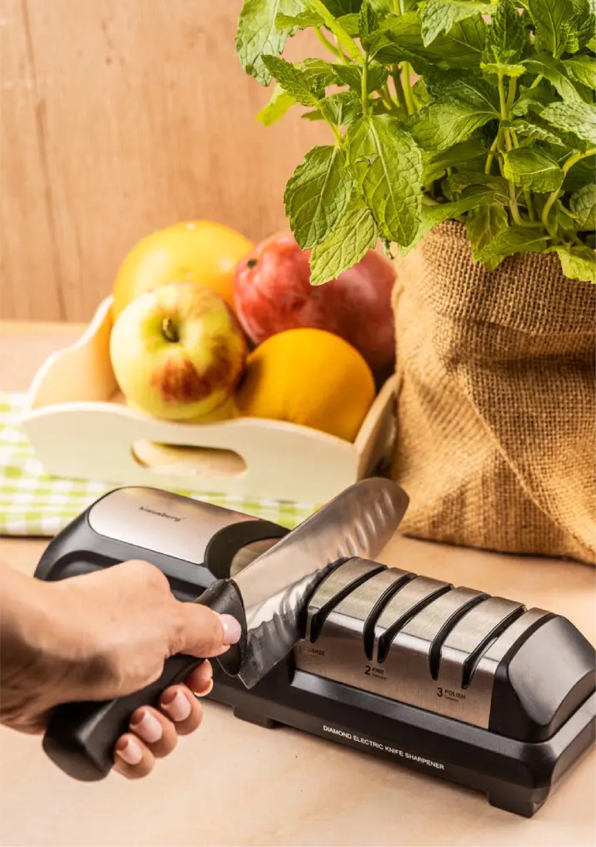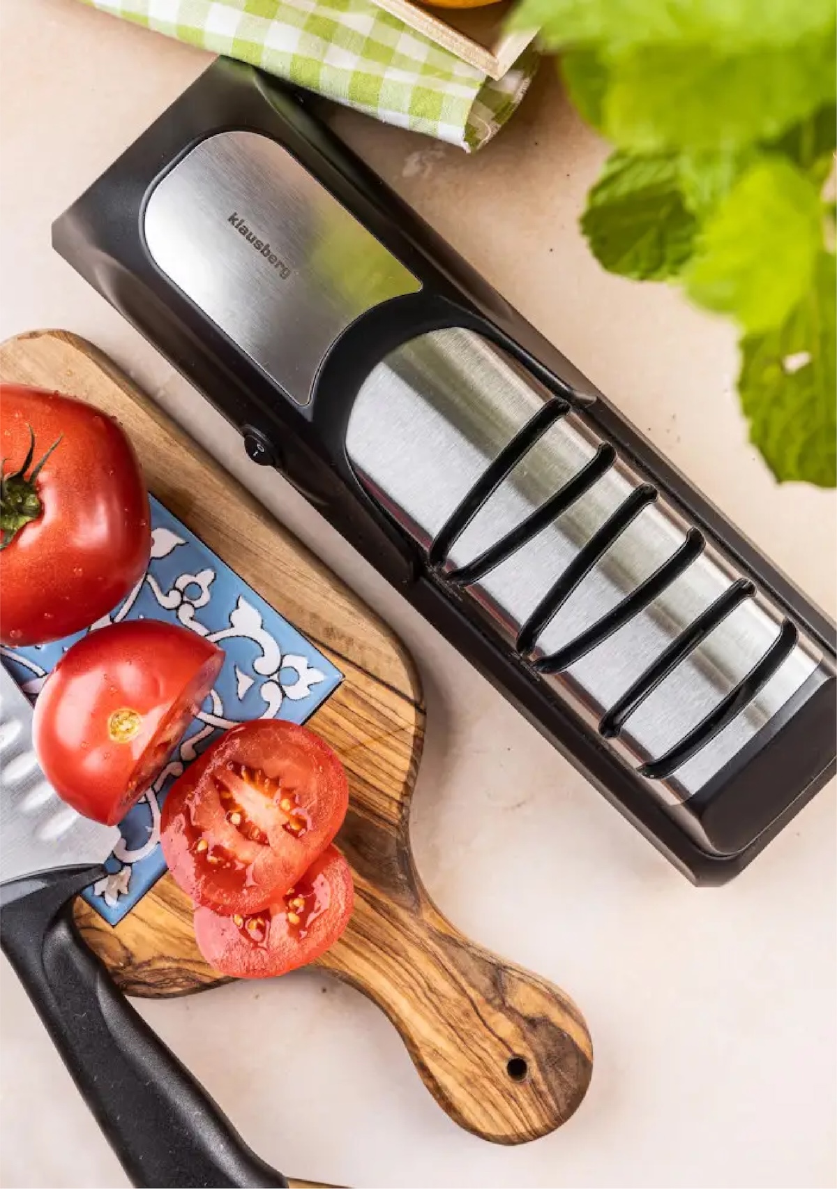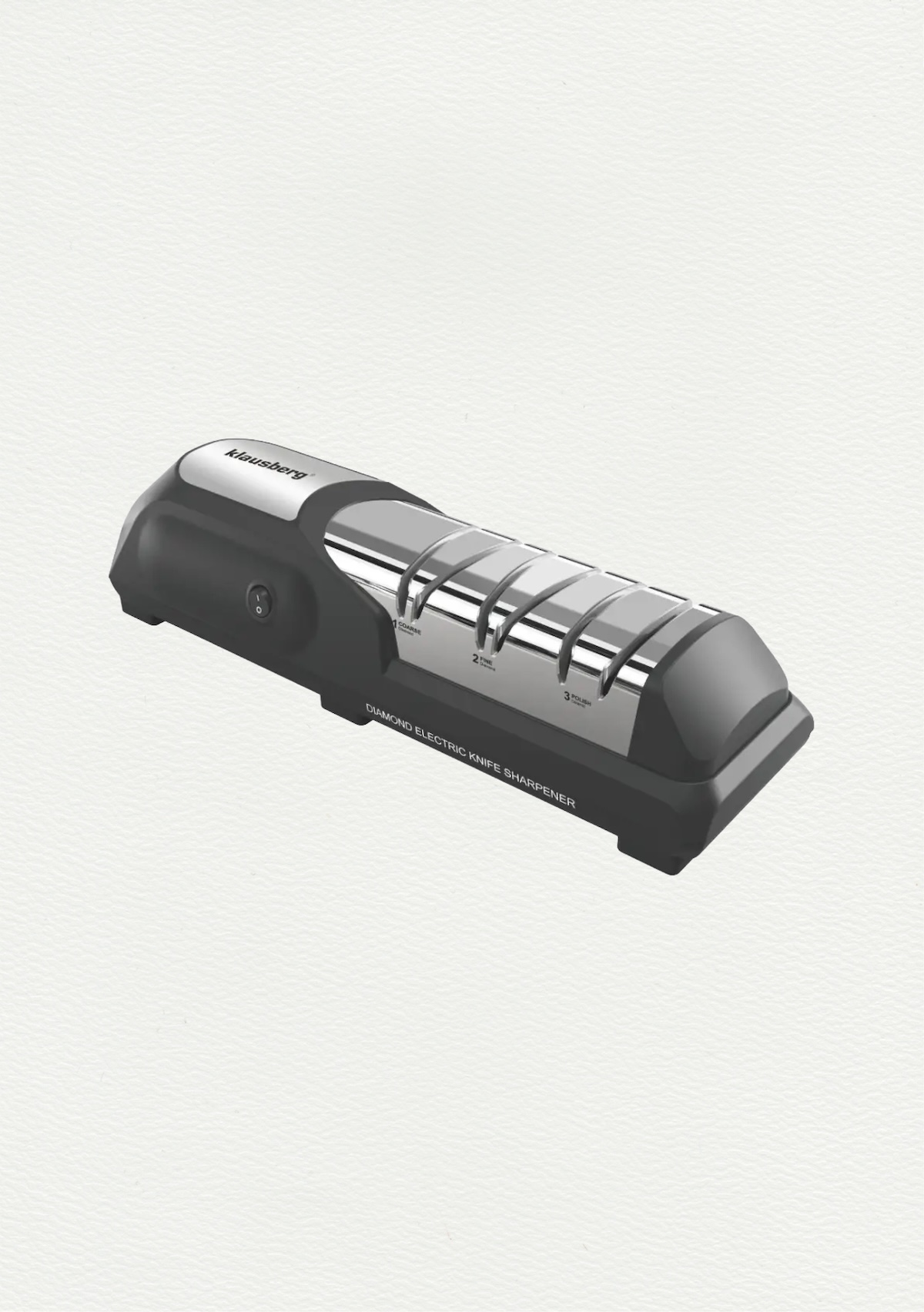 De professionele elektrische 3-traps diamantslijper van KLAUSBERG is een modern apparaat dat diamanttechnologie combineert met een drietraps slijpsysteem, wat de perfecte scherpte van elk mes garandeert. Dankzij de precieze geleiders en solide constructie is slijpen snel, veilig en uiterst effectief.