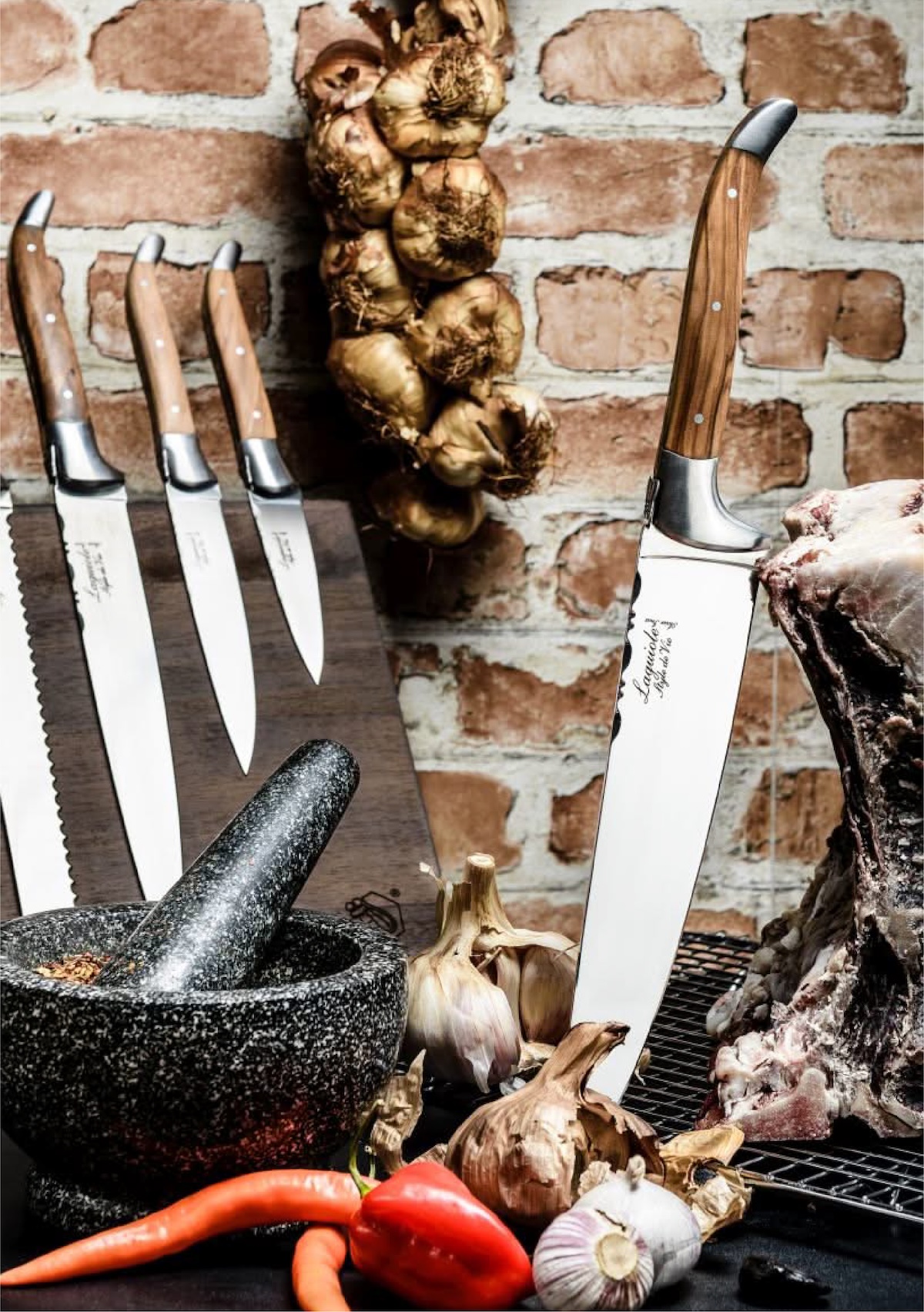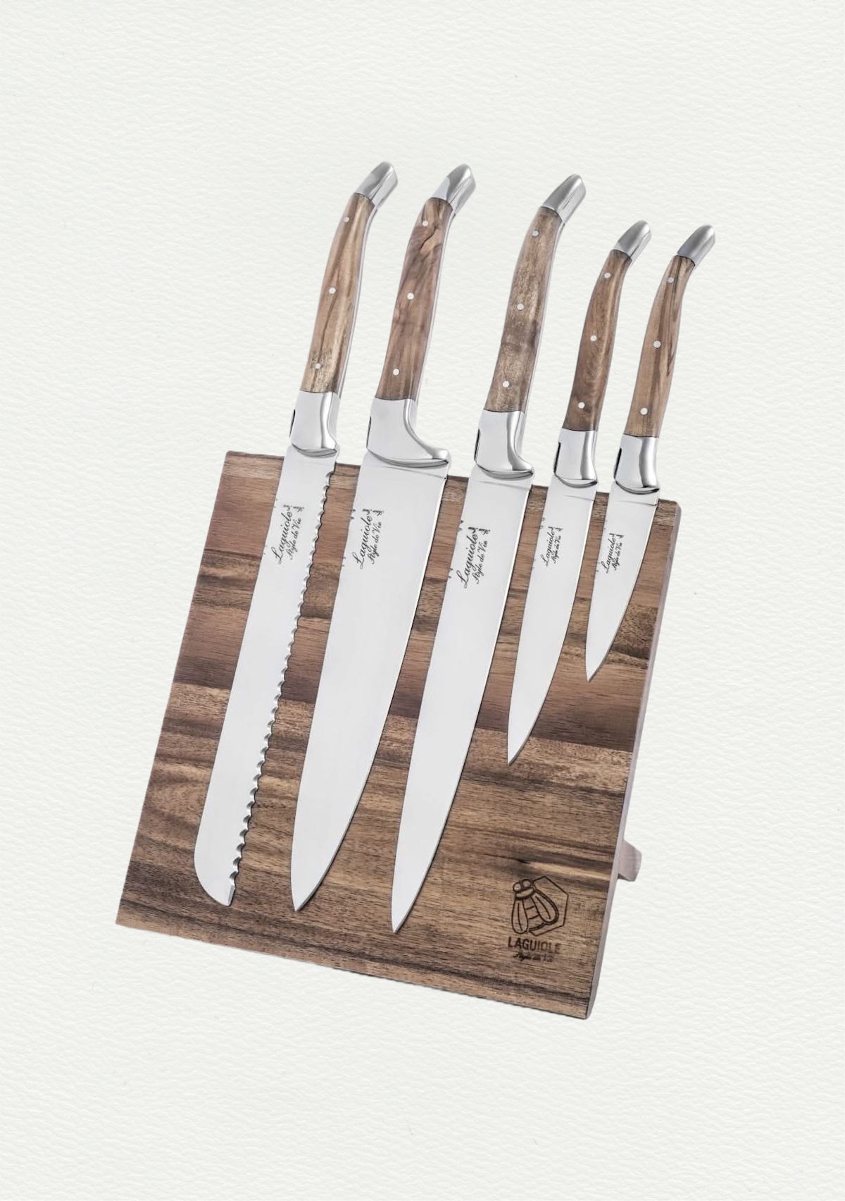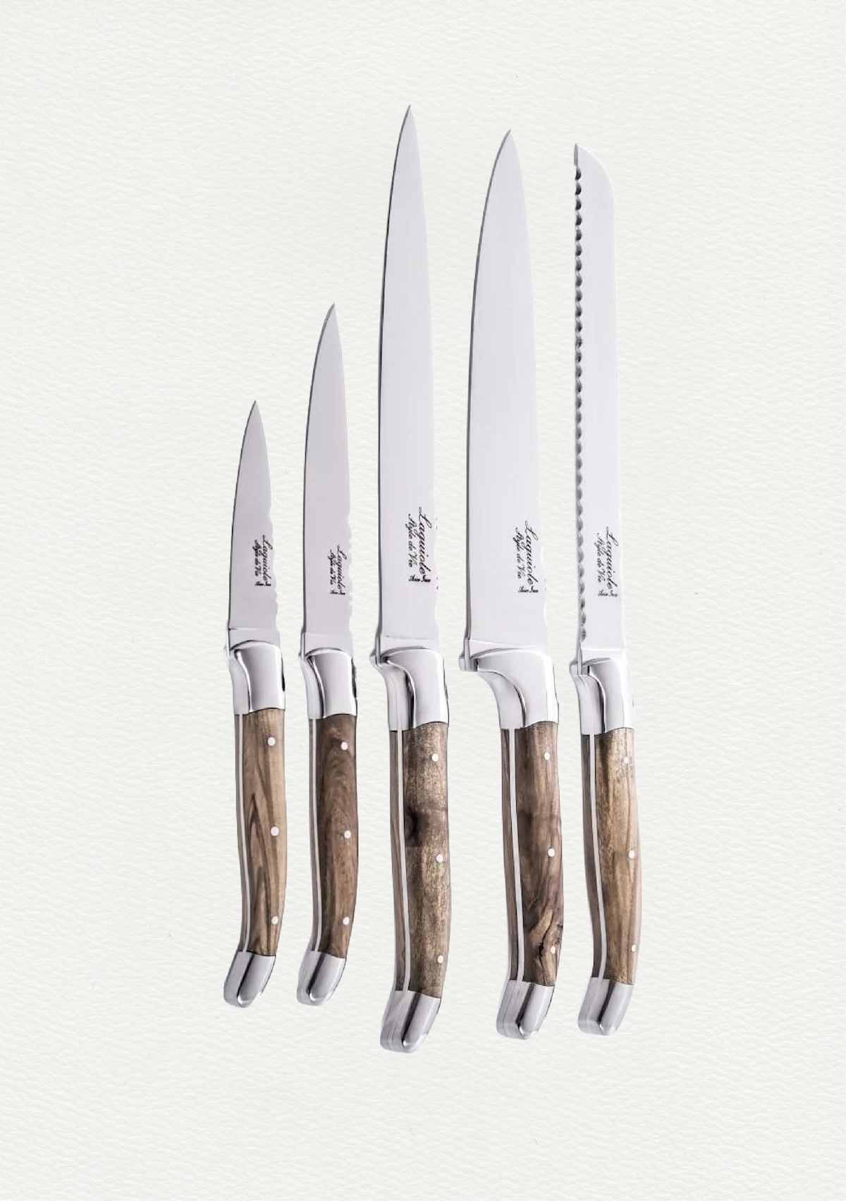 De set bestaat uit een koksmes, vleesmes, universeel mes, schilmesje en een broodmes. Alle messen hebben een lemmetdikte van 2,5 mm en zijn door hun olijfhouten handvat niet vaatwasmachinebestendig.