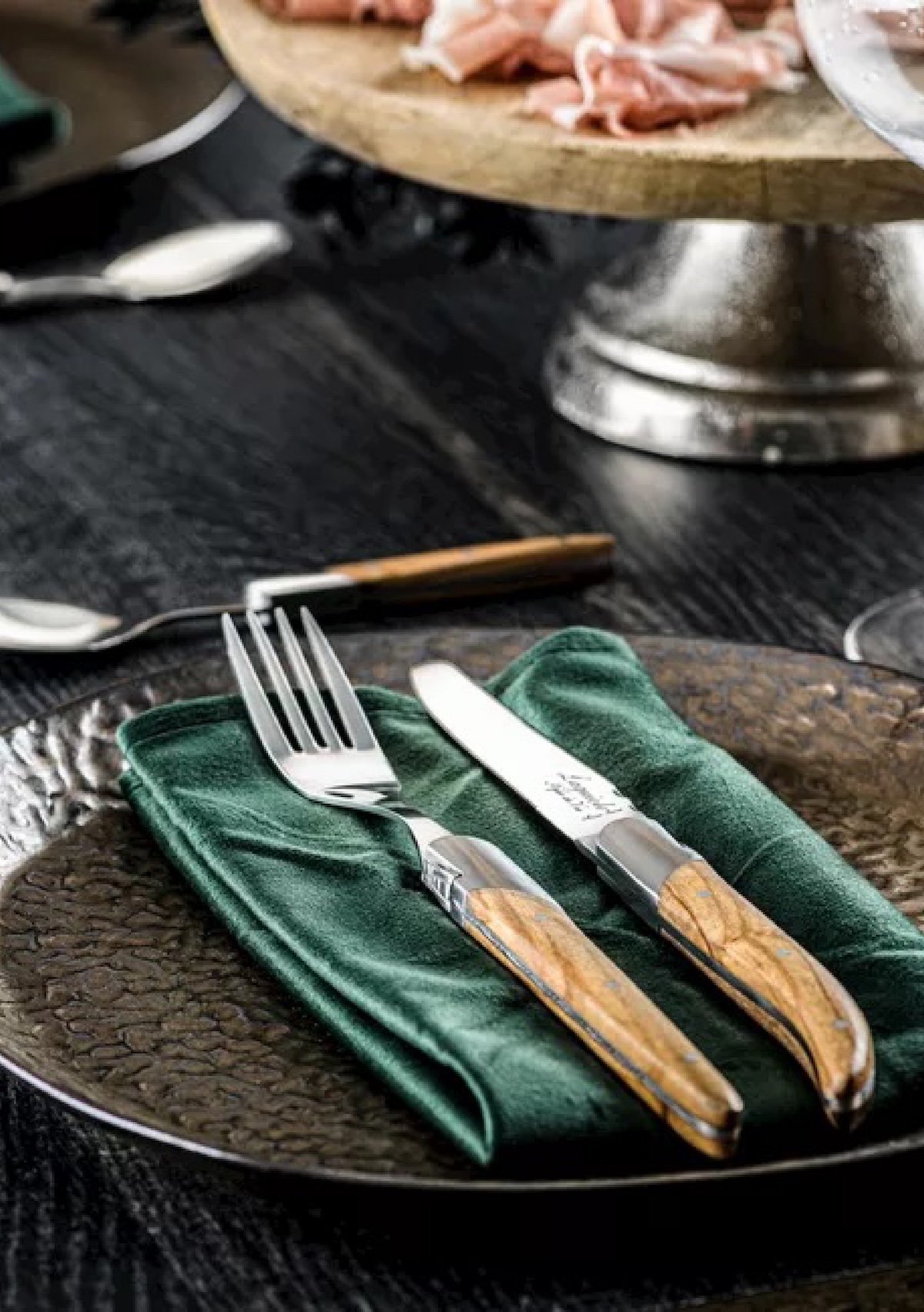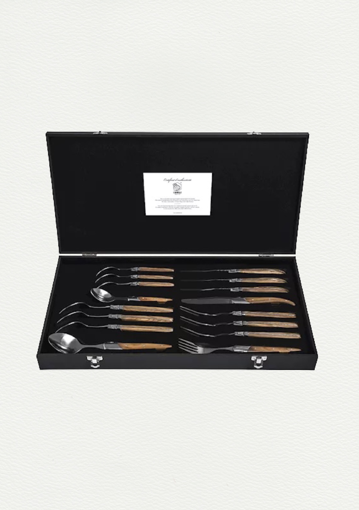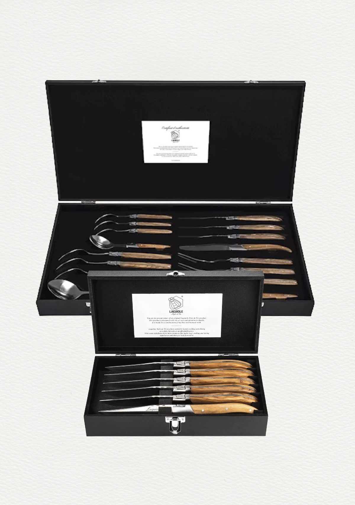 Voor wie echt wil uitpakken, is deze luxueuze couvert perfect! Deze 16-delige set heeft een zeer chique uitstraling waarmee je elke maaltijd net even wat extra’s geeft. Zo heb je altijd vrolijke gasten aan je tafel! Het couvert uit de luxury line van Laguiole Style de Vie is gemaakt van rvs en olijfhout waardoor het niet vaatwasmachinebestendig is. De dikte van het couvert is 2,5 mm en het is verpakt in een mooie luxe zwarte kist. Handig om het netjes op te kunnen bergen.