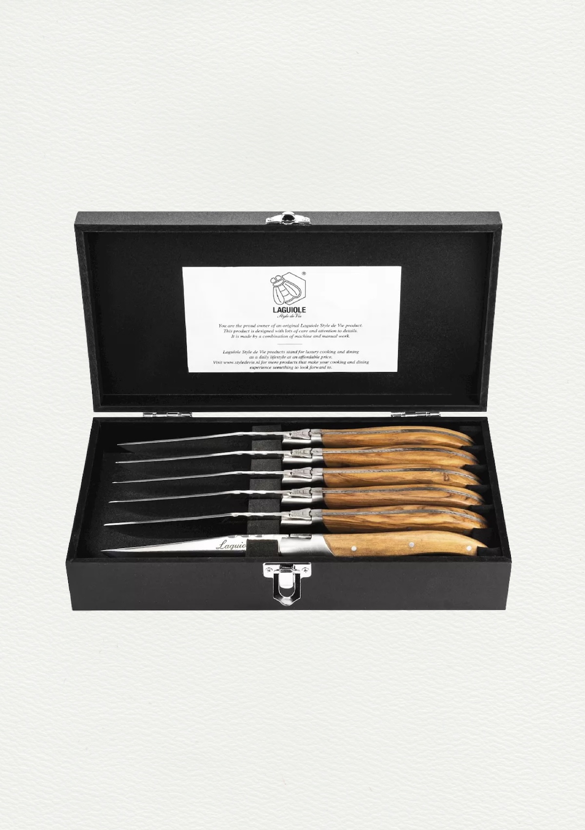 Al jaren een van de best verkochte producten van Laguiole Style de Vie: de luxury line steakmessen olijfhout. Prachtig afgewerkt en met een dikte van 2,5 mm van zeer hoge kwaliteit. De steakmessen hebben een glad scherp lemmet waardoor je elk stukje vlees perfect aansnijdt. De steakmessen zijn niet vaatwasmachine bestendig.